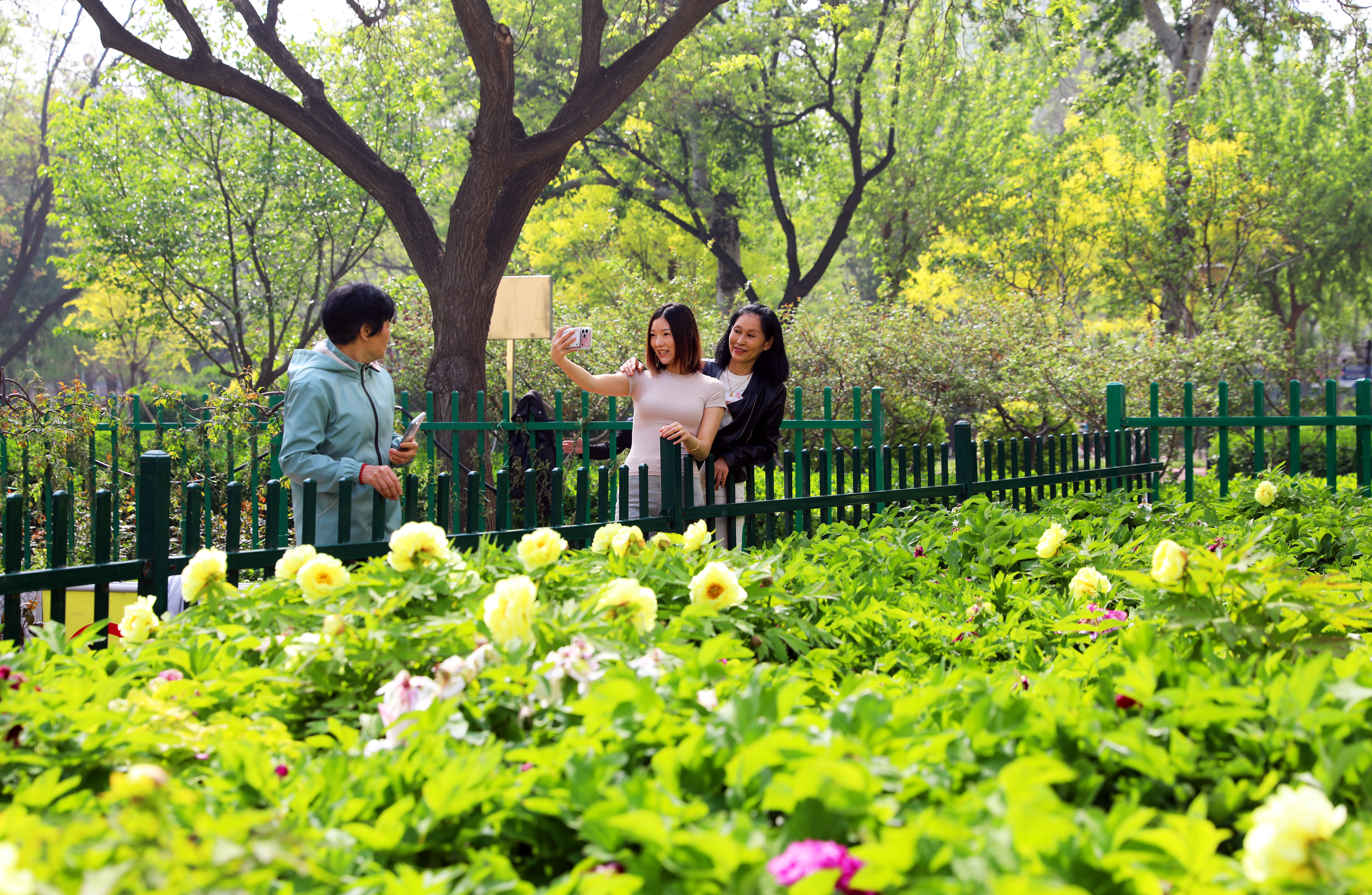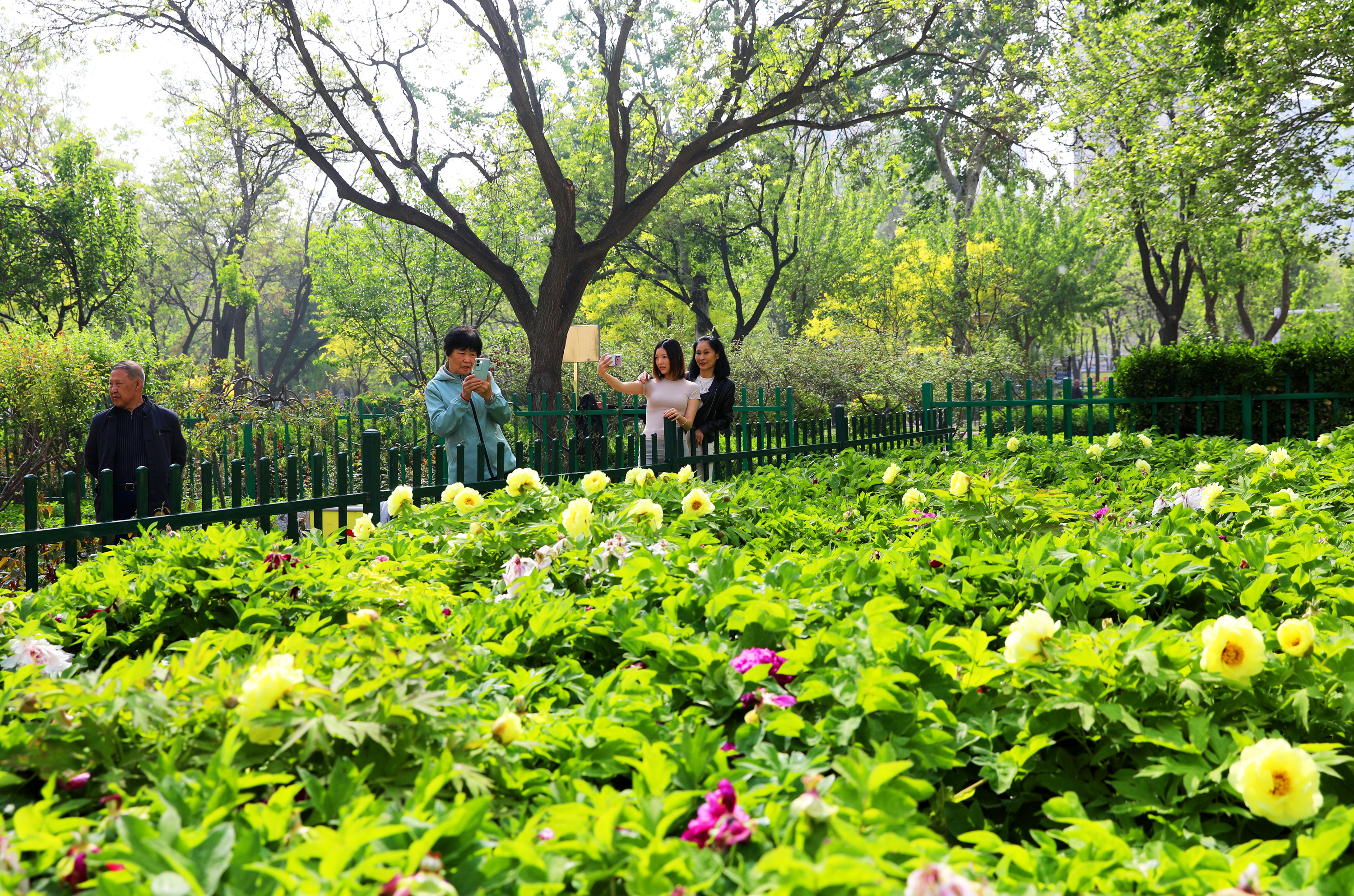 4月16日,一场春雨过后,衡水市区中华公园内的花草树木焕然一新。经过雨水的冲刷,园内树木愈发青翠,各类花草鲜嫩欲滴,其中最引人注目的牡丹在清新的空气中竞相绽放、风姿绰约,为春日公园增添了一抹亮色,吸引大批市民前来驻足观赏、拍照留念,沉浸式感受雨后春日里的国色芳华。