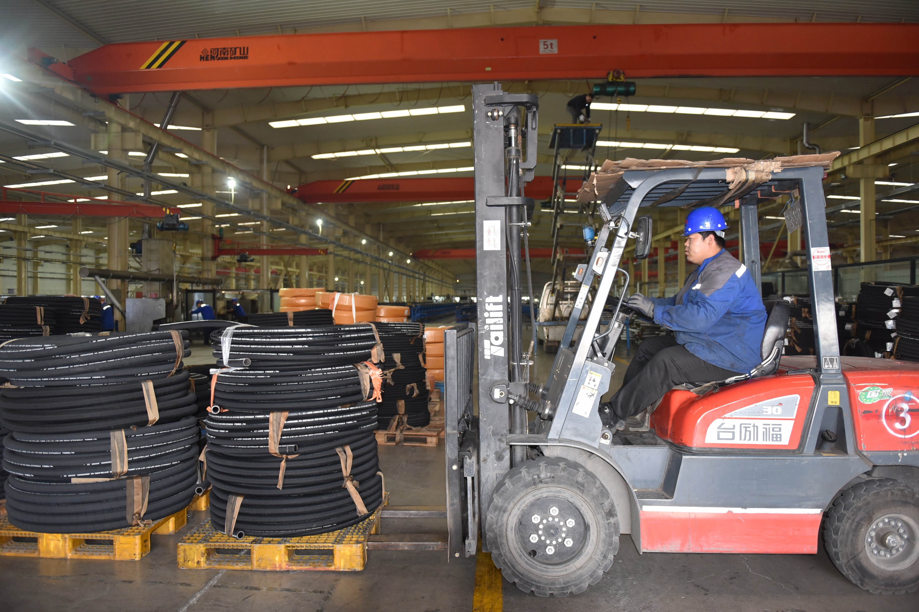 在河北西伯力特种橡胶有限公司车间,工人在操作叉车搬运成品橡胶管。高雷 摄