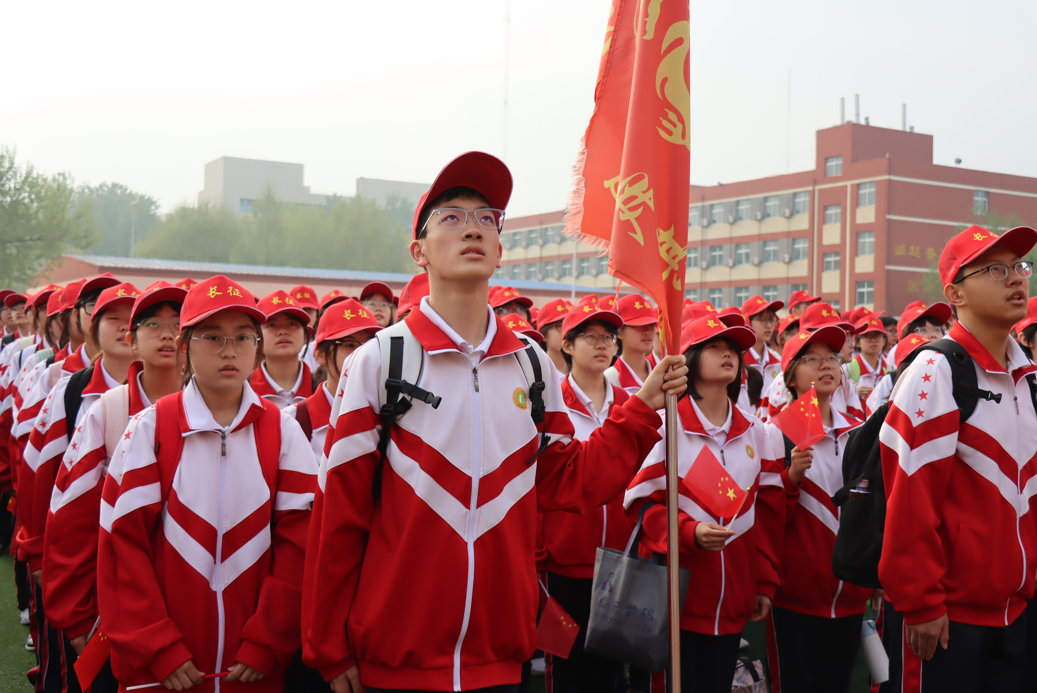 仪式上,学校党委副书记、校长安志平为远足队伍庄严授旗,鲜红旗帜迎风舒展,传递责任与使命。衡水市教育局督学、校党委书记白祥友带领全体师生齐声诵读《七律・长征》,“红军不怕远征难,万水千山只等闲”的豪迈诗句响彻校园,将现场气氛推向高潮。为纪念长征胜利九十周年,同学们以整齐队列摆出“长征・90”造型,以青春之姿致敬革命先辈,传承红色血脉。