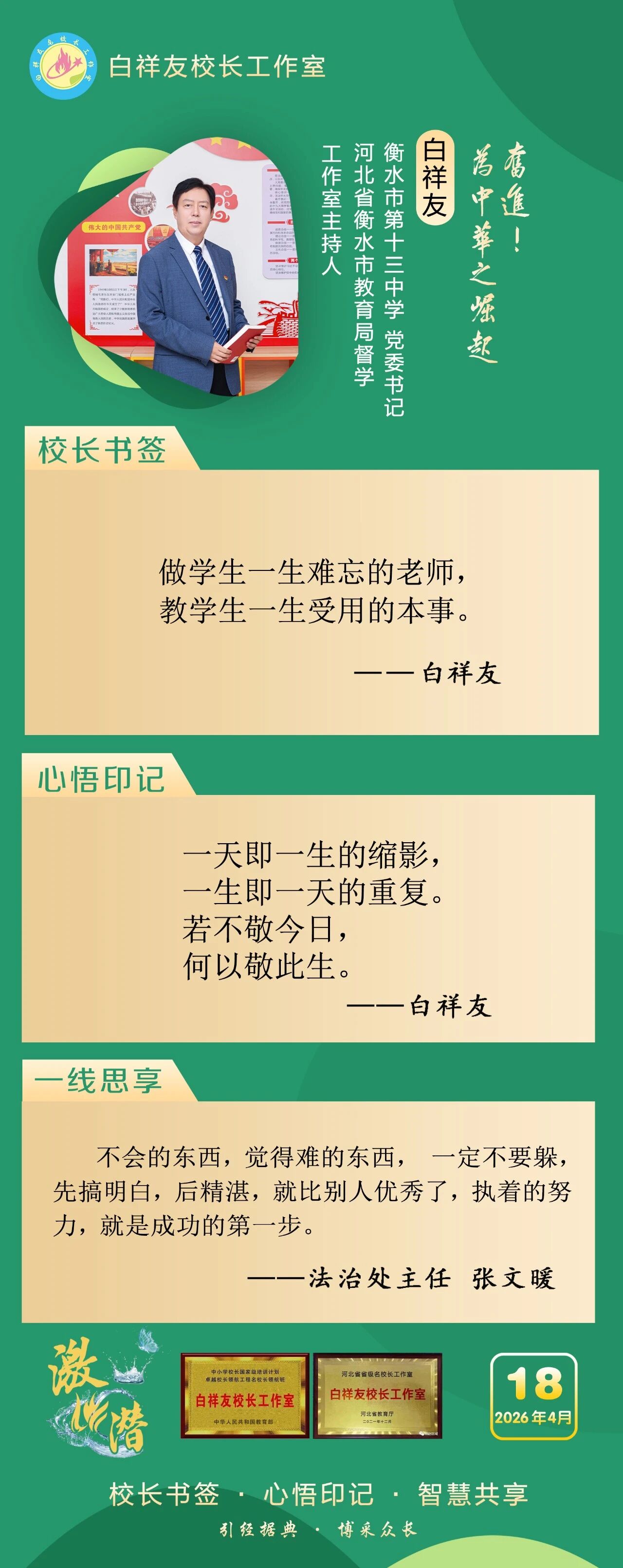 “白祥友校长工作室”成立于2019年4月,是教育部“国培计划”中小学名校长领航工程、河北省首批名校长工作室,目前省内外成员校59所。工作室坚持“资源共享、智慧共融、互助共赢”理念,已成为思想碰撞的交流场,资源共享的品牌站,成果展示的辐射源。 点赞 +1 微博 微信 我要评论 发布 相关推荐 白祥友校长工作室成员新疆实验中学冯永庄校长一行来衡水十三中参观交流 教育大观 03-23 热门 一天 三天 一周 1 衡水市冀州区开展“阅见书香之美 共筑阅读之城”春季书香节主题活动 2 【新思想引领新征程】推进数字中国建设 打造高质量发展新引擎 3 衡水市原创歌曲优秀作品展演在安平杨屯唱响 4 衡水市2026年新时代乡村阅读启动仪式在武邑举办 书香赋能乡村振兴 5 书香润乡土 诵读颂春天 安平县“4·23 世界读书日”朗诵音乐会点亮乡村文化夜 6 值班总编说报|奋楫笃行日争新 唱响发展“春之歌” 7 天天学习|让百姓少跑腿、信息多跑路 8 张家口:“共享智造”打破资源壁垒,激活产业集群新动能 9 聚焦“固链、强链、补链、延链” 河北省实施电子信息产业链攻坚行动 10 衡水新华书店:全民阅读 点亮城市书香 1 花田里的“金色突围”——探寻安平杨屯油菜花全产业链密钥 2 衡水市药品不良反应监测中心获全国通报表扬 3 姚黄魏紫初绽蕊 满园春色惹人醉 衡水中华公园牡丹花开了 4 千年塔下诵经典! 衡水市景县举办世界读书日主题活动 5 百余件(套)冀派内画精品走进甘肃瓜州 6 河北故城:启动“护苗·绿书签”行动 书香校园里播撒“绿色”种子 7 冀州:科技赋能田管 护航冬小麦返青拔节 8 衡水德州市场监管联动 优化外资营商环境 9 衡水市冀州区开展“阅见书香之美 共筑阅读之城”春季书香节主题活动 10 2026年京津冀“衡实杯”马术赛完赛 1 “妈妈你在哪儿” 衡水刘风旭寻找走失18年的母亲盼团圆 2 零碳引领 绿色同行 衡水市“一起益企 订单式服务”绿色低碳发展 专题活动成功举办 3 《互联网平台价格行为规则》正式实施 明确禁止“大数据杀熟” 4 春管正当时 安平多措并举守护冬小麦生长 5 武邑籍北京声乐老师为衡水建市30周年谱写赞歌 6 孙犁故里:“一荷”文风传世 满卷书香致远——我市文化建设走笔之八 7 2026雄安马拉松鸣枪开跑 8 衡水市市场监督管理局开展生鲜肉品专项突击夜查行动 守护群众“舌尖上的安全” 9 【小牛大凯帮办团】衡水:露天垃圾池拆了 崭新垃圾桶“上岗” 10 潮启桃城 创意筑梦! -衡水世茂52+携手衡水学院美术学院启幕IP大赛暨校企合作签约仪式 广告 广告 广告 24小时 1 衡水新华书店:全民阅读 点亮城市书香 2 河北衡水:孔颖达公园休闲打卡正当时 3 阜城县6万余亩西瓜喜获丰收 科技赋能助农增收 4 零距离体验“蓝焰”风采 武邑县组织大学生走进消防救援大队 5 版权宣传“零距离” 企业发展“有底气” 版权专家到枣强县大营镇宣讲皮草业版权保护 6 中华财险衡水中支开展全民国家安全教育日主题观影活动 7 衡水故城县残联为40名听力残疾人免费适配助听器 8 母婴培训进社区 公益赋能暖民心 冀州区信都社区开展科学育儿公益课 9 衡水滨湖新区举办千人诵读《论语》活动 10 探秘衡水四院“骨骼判官”