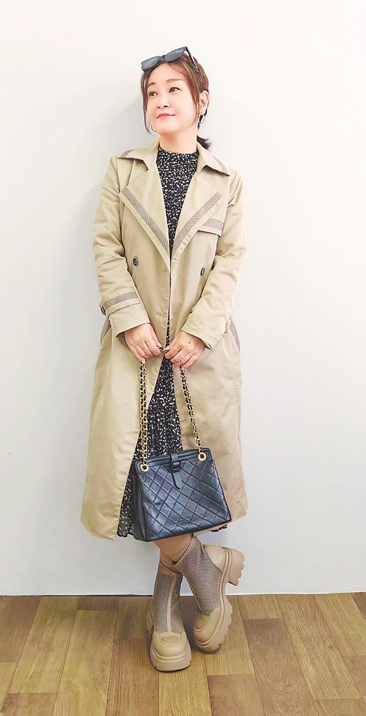搭配核心:经典卡其色中长风衣+黑底碎花连衣裙+厚底网靴+菱格链条包(如图①)