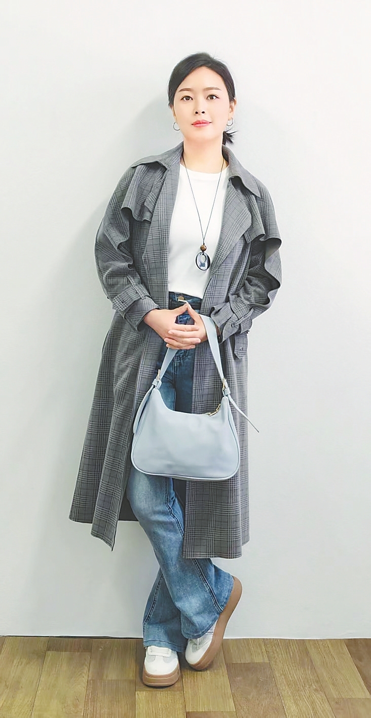 搭配核心:灰格纹中长风衣+白色基础T恤+微喇牛仔裤+小白鞋+雾霾蓝包(如图②)