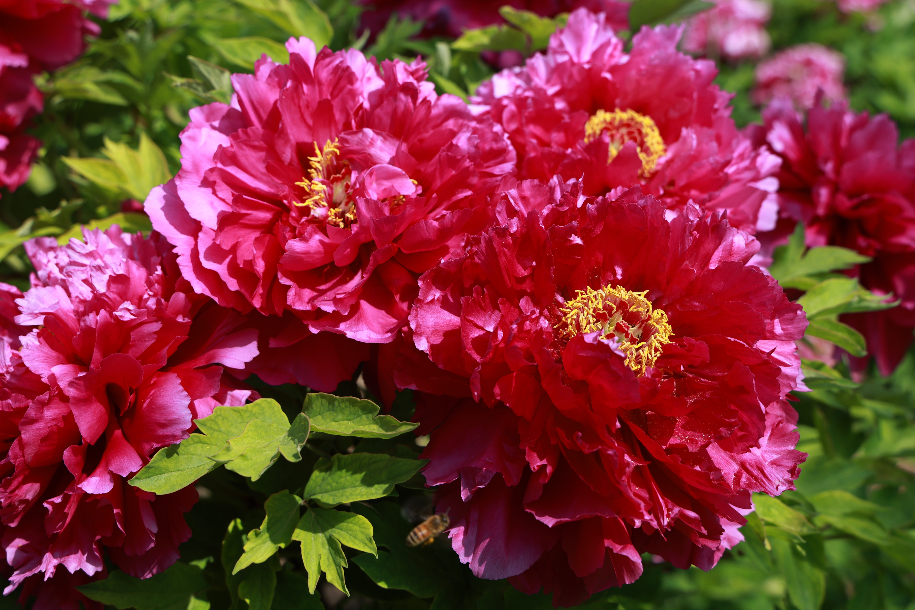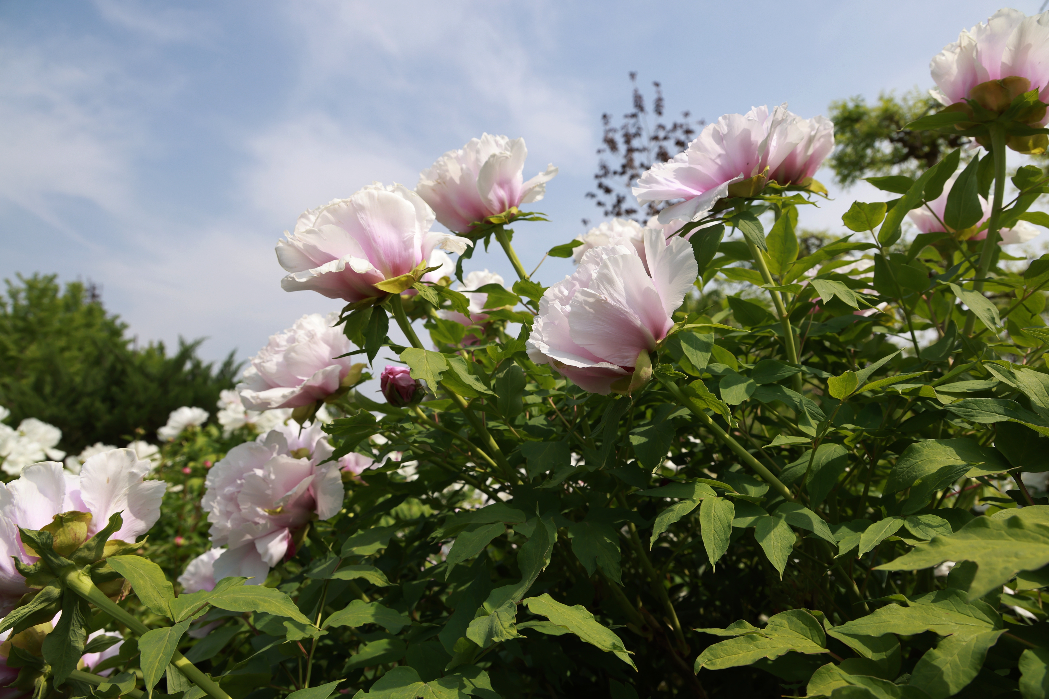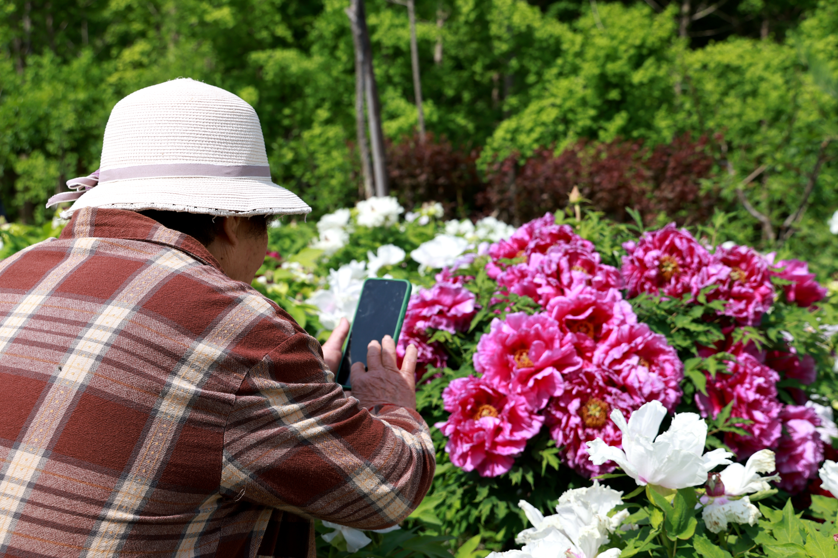 牡丹园里,洛阳红、黄冠、丁香紫等等20多种牡丹品种娇艳欲滴,身姿在微风中轻轻摇曳,红如火,粉若云,白如雪,尽显雍容华贵之态。游客们或驻足花前拍照留影,或漫步花丛细嗅芬芳,不时传来对美景的赞叹。