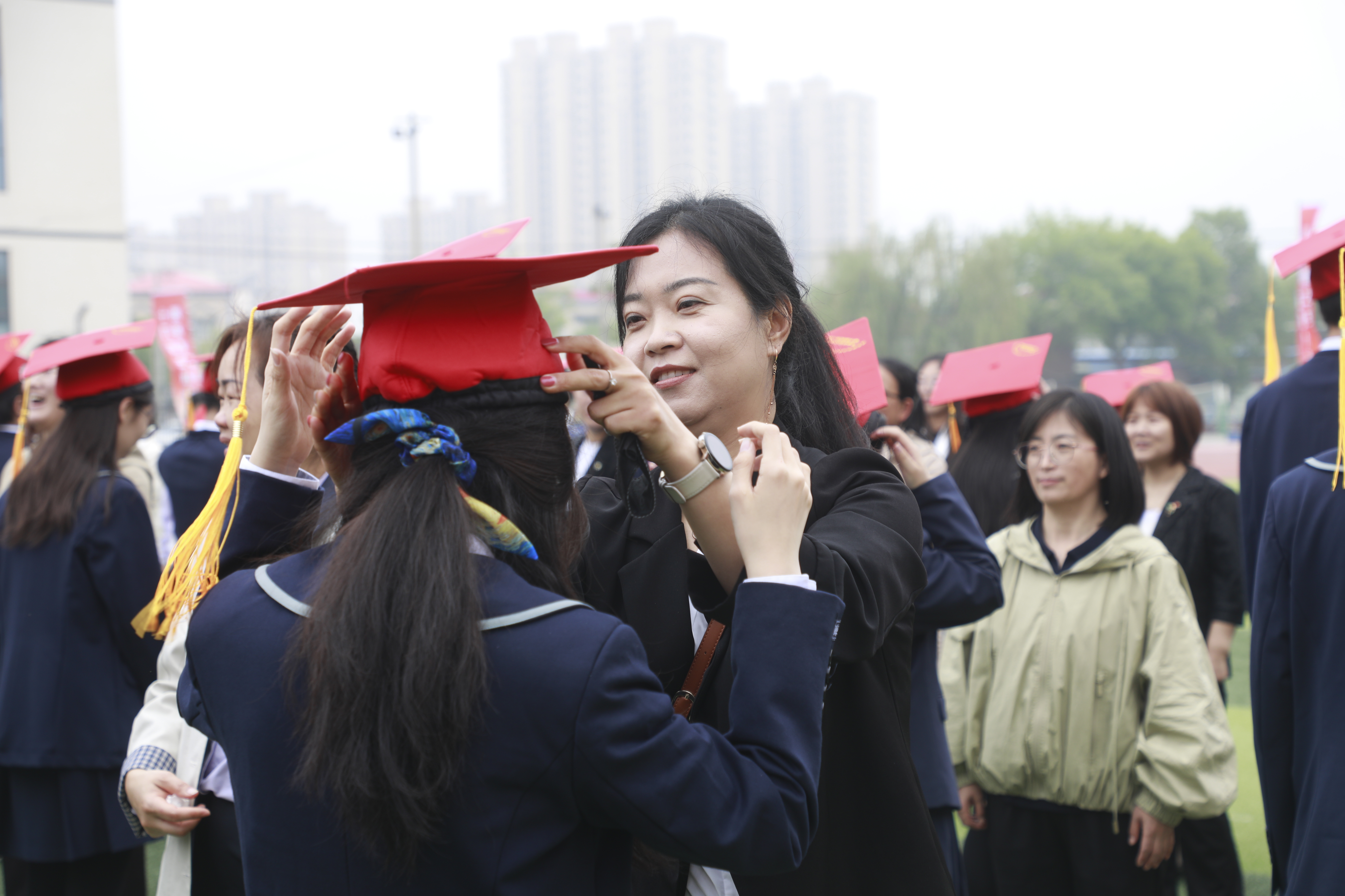 冠礼是中华传统成人礼仪,家长们亲手为孩子郑重地戴上成人帽,标志着少年从懵懂孩童蜕变为肩负责任的成年人。全体学生向父母三鞠躬,感谢他们多年来的日夜操劳和无私付出。父母、师长为孩子们戴上眼罩,搀扶孩子踏上成才路,穿过5道代表人生不同阶段的大门,象征从幼年到成年的成长历程。走过襁褓门,寓意18年前孩子降生,带给家庭惊喜和希望;走过始龀门,见证童萌初绽放,开始读书识字明理,为人生奠定坚实根基;走过舞勺/豆蔻门,青春年华含苞待放,闪烁着朝阳与露珠碰撞的光芒;走过成人门,孩子摘下眼罩为父母戴上,代表角色互换,成为家庭担当和民族未来;走过报国门,将个人成长嵌入时代发展的洪流,肩负起家国赋予的神圣使命。