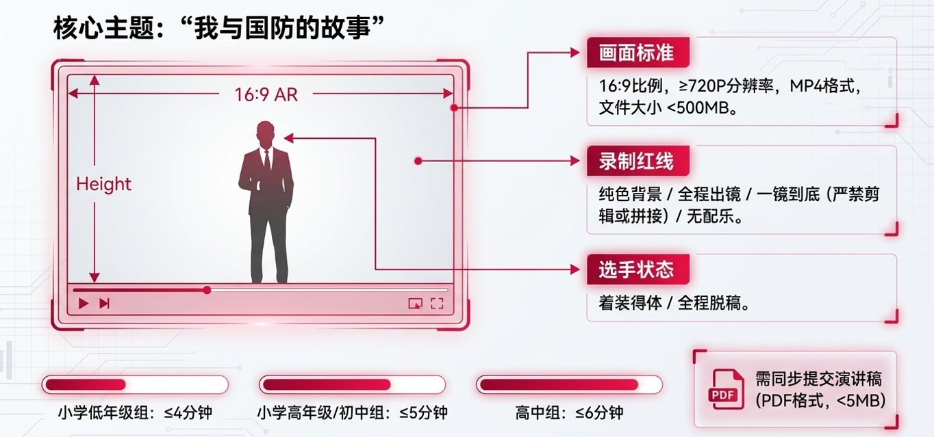 “爱我国防”主题演讲赛。作品主题为“我与国防的故事”。参赛形式为个人赛(1名学生+1名教师)。