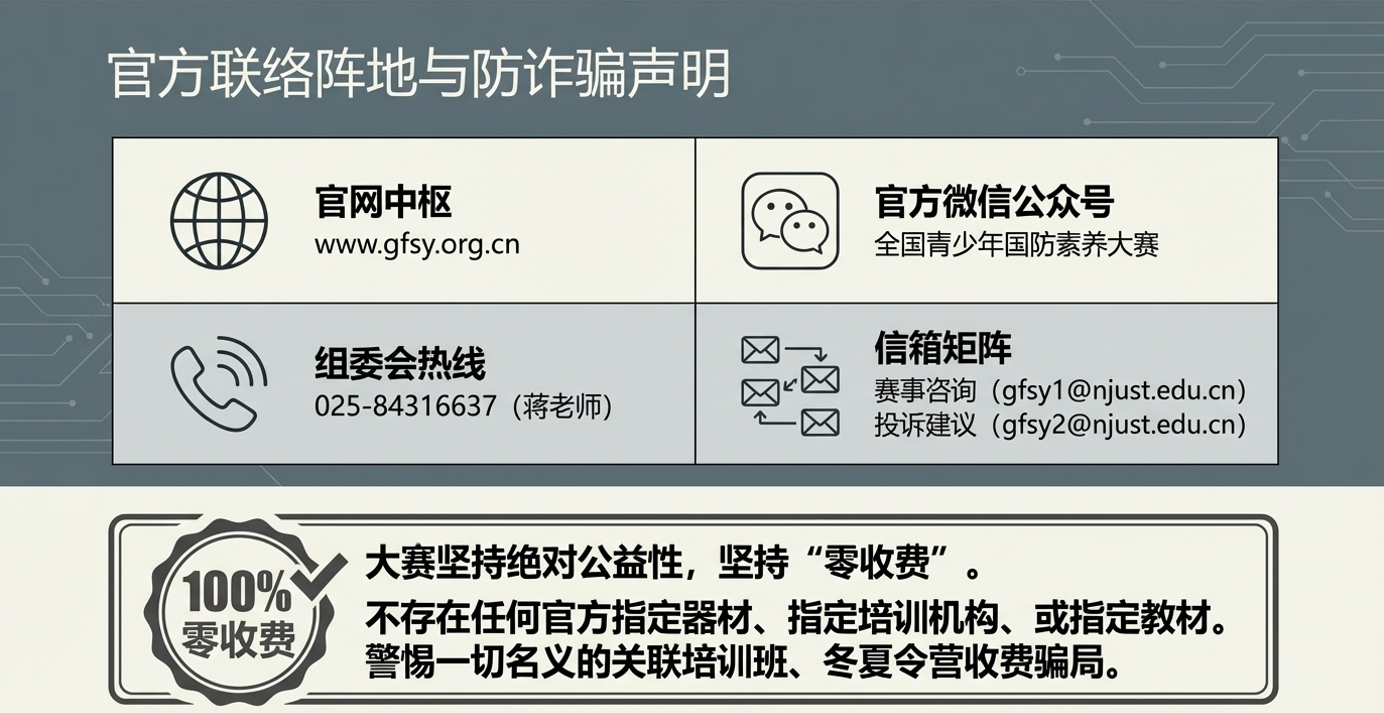 赛事通知、报名、赛程、证书查询等信息均通过大赛官方网站(www.gfsy.org.cn)及官方微信公众号“全国青少年国防素养大赛”发布。