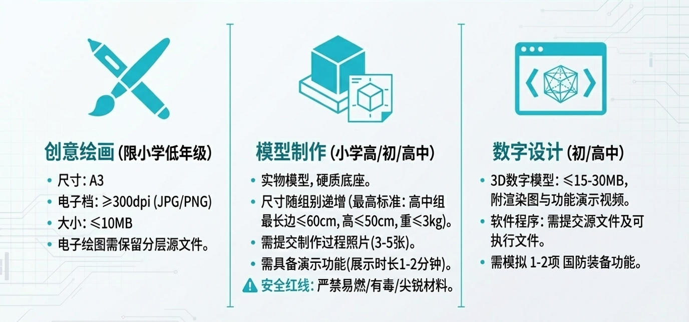 国防科技创意设计赛。赛项主题为“科技守卫家园”,参赛形式为个人赛(1名学生+1名教师)、团体赛(不超过3名学生+1名教师)。参赛范围为小学低年级组(1-3年级)、小学高年级组(4-6年级)、初中组、高中组(含中职)。