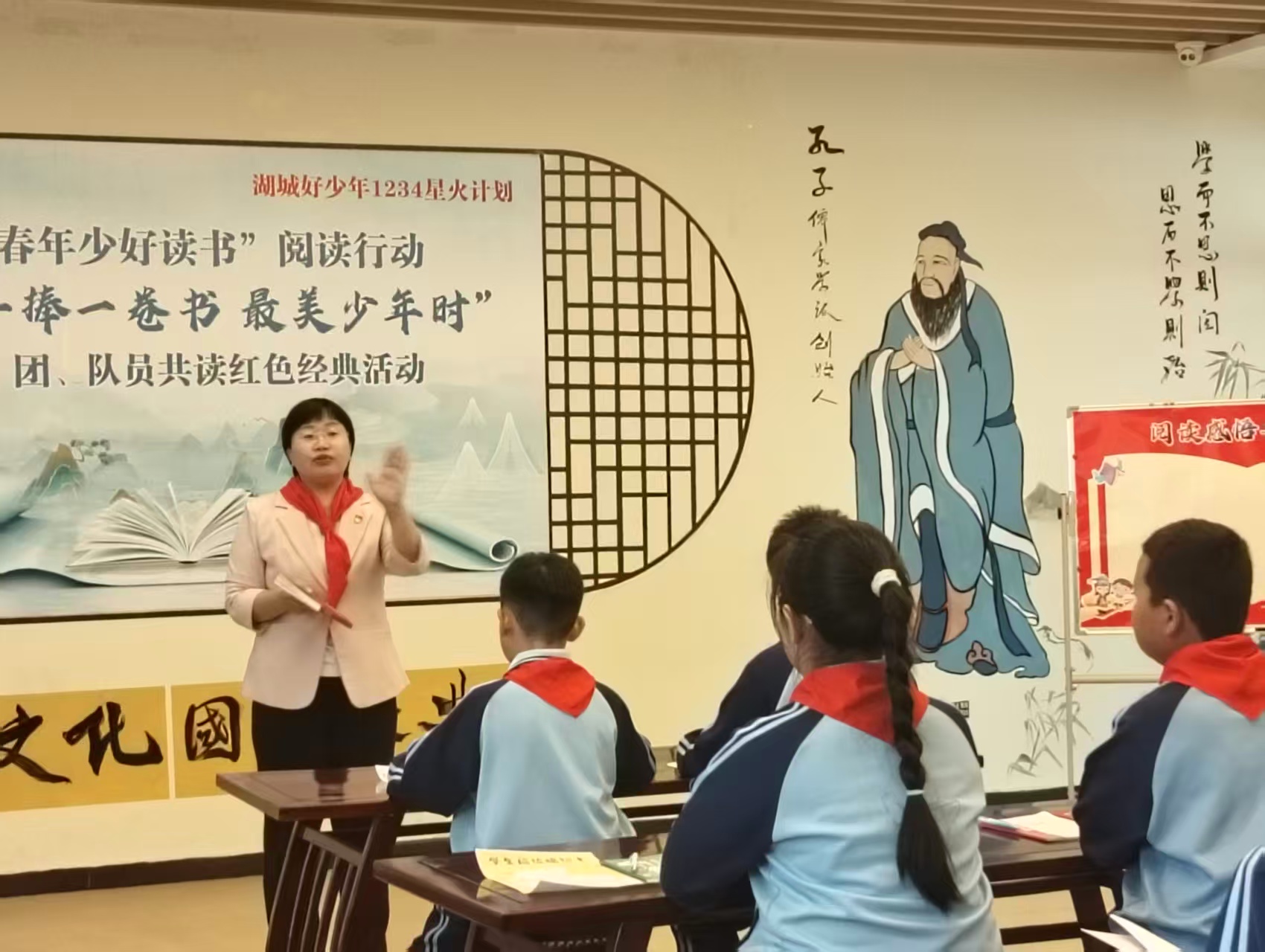 活动在少先队辅导员荐书中拉开序幕。省红领巾巡讲团成员王东玲老师为队员们推荐了红色经典书籍《十四岁的长征》,从题目谈及主人公人物设定以及“红军不怕远征难、万水千山只等闲”的精神,从封面插图浅论故事背景,旁征博引、气定神闲,将书籍的主要内容与精神内涵娓娓道来。她说:“书中小战士们和孩子们年龄相仿,他们不怕困难、坚韧不拔的长征精神,正是新时代少年儿童需要学习和传承的红色品格。希望孩子们能在阅读中有所感悟、汲取奋进的力量。”