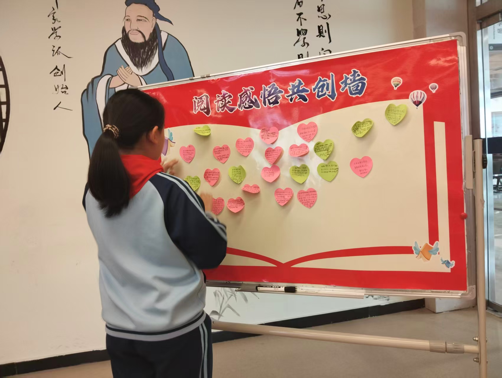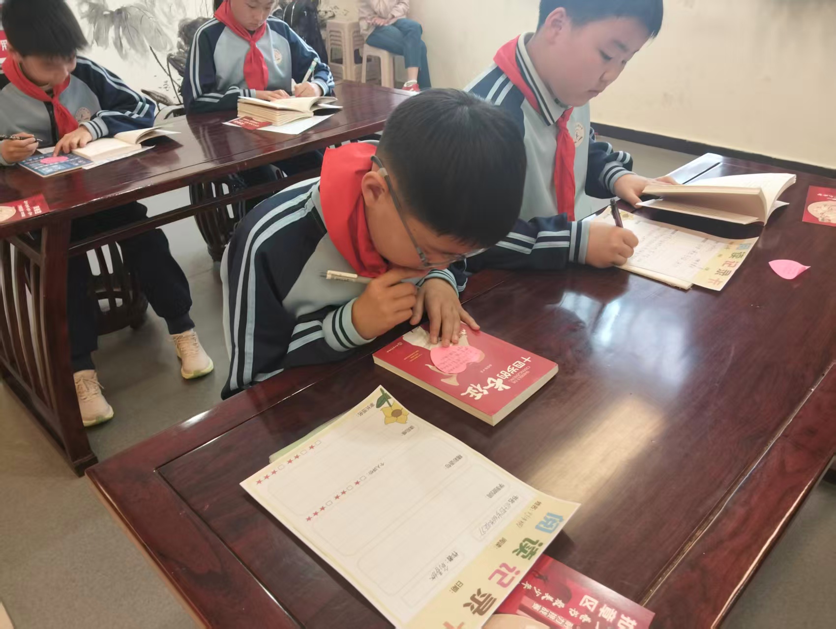 在自主品读的“阅读长征耐力挑战”环节,队员们静心阅读,认真记录经典语句、写下阅读感悟。80分钟的深度阅读中,每人专属的“长征路线扣章卡”上,每隔10分钟便可盖上一枚象征前进的印章,盖满8个即挑战成功,走完“阅读长征路”。互动交流中,大家踊跃上台,围绕随机抽取盲盒中的问题,分享自己在阅读中收获的最深刻感悟和体会。“长征路上的一步步脚印里都是辛苦的汗水,我要学习这种不怕苦的精神,跨过人生的困难。”“今天的和平是前辈们辛苦奋斗来的,我们也要好好学习,为祖国的明天奋斗。”随后,大家将自己的阅读感悟和理解、最喜欢的句子、阅读的疑问、想对书中人物说的话等,写在便利贴上,粘贴至共创墙上。