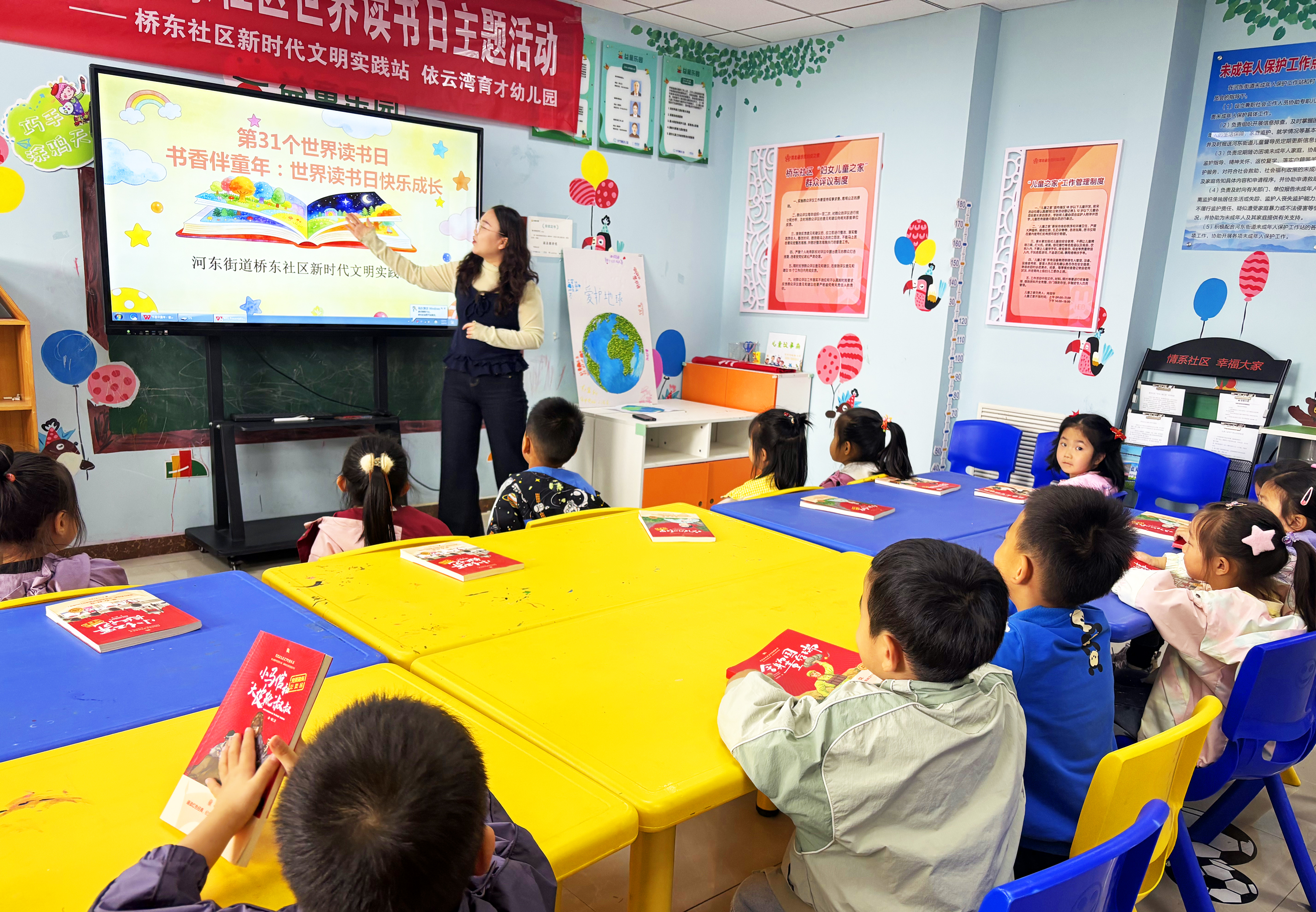 活动现场,社区工作人员用生动通俗的语言,向孩子们讲解了世界读书日的设立背景、发展历程以及设立意义,引导孩子们了解阅读的重要性,激发他们的阅读兴趣。随后,工作人员带领孩子们开启了“书本奇妙之旅”,通过趣味讲解、互动提问等方式,带领孩子们走进书本的世界,感受文字的魅力,在轻松愉悦的氛围中体会阅读带来的快乐。
