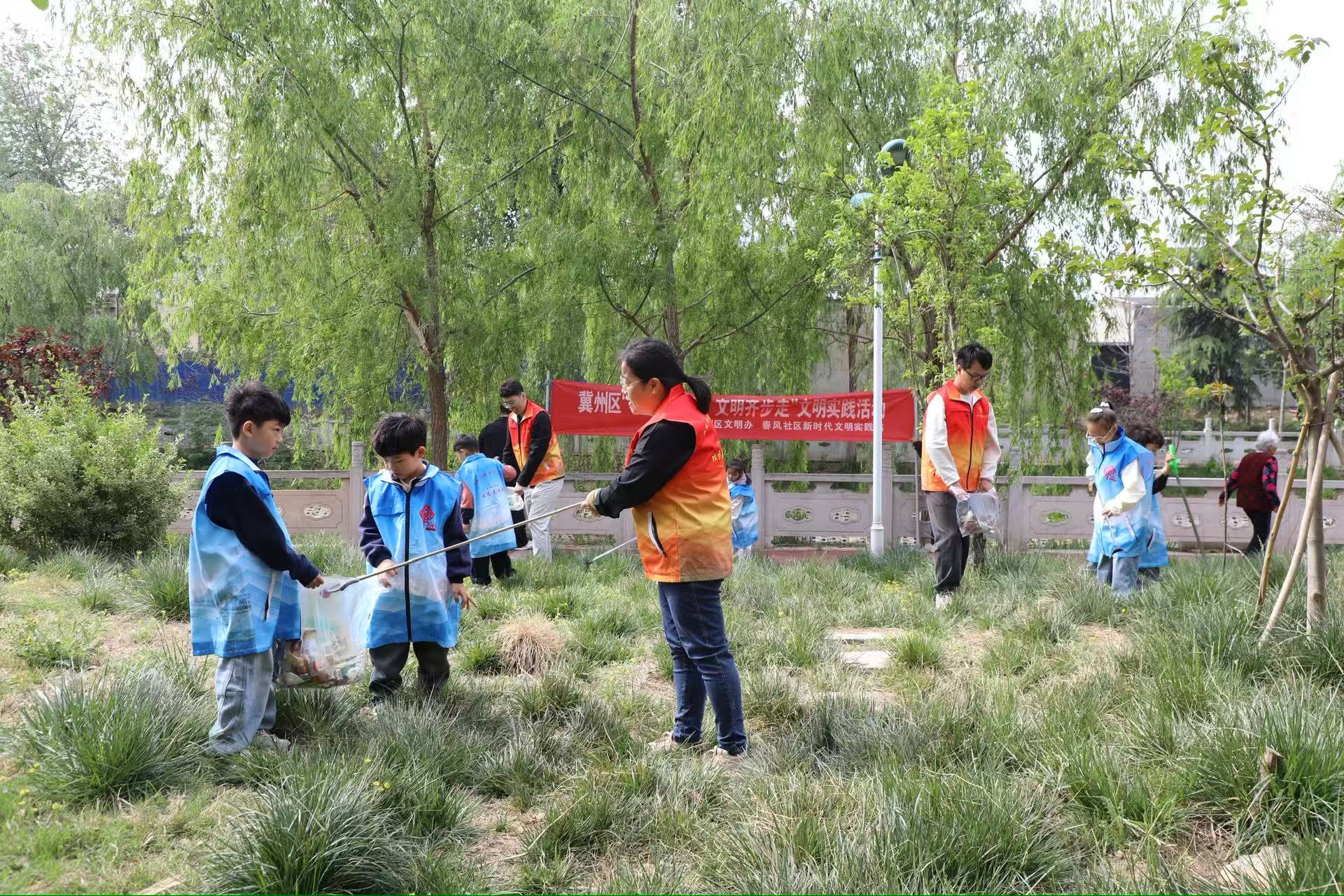 4 月 23 日,冀州区文明办联合春风社区新时代文明实践站在洛津溪公园组织开展了“小手拉大手·文明齐步走”文明实践活动。社区工作者及幼儿50余人化身“环保小卫士”,通过捡拾垃圾、清理草坪等方式,为城市添绿、为文明增色。