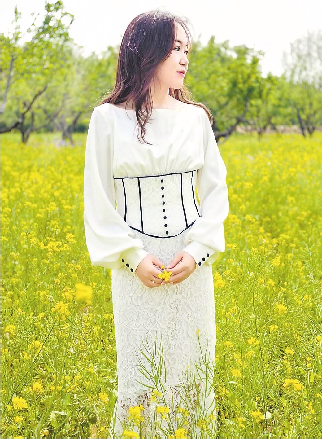 第二套白色长裙(如图②),将小个子的精致感拿捏得恰到好处。这条裙子的核心亮点就在腰腹处的黑色线收腰设计,像一条天然的视觉分割线,既放大了腰细、腿长的优势,同时又悄悄遮住了腰腹部的小赘肉。细节上,灯笼袖设计修饰了手臂线条,微收的蕾丝鱼尾裙摆从腰部到脚部逐渐舒展,既不会像紧身裙那样暴露胯宽问题,也避免了宽松长裙的压个子弊端。搭配低跟鞋,温柔气质感拉满。
