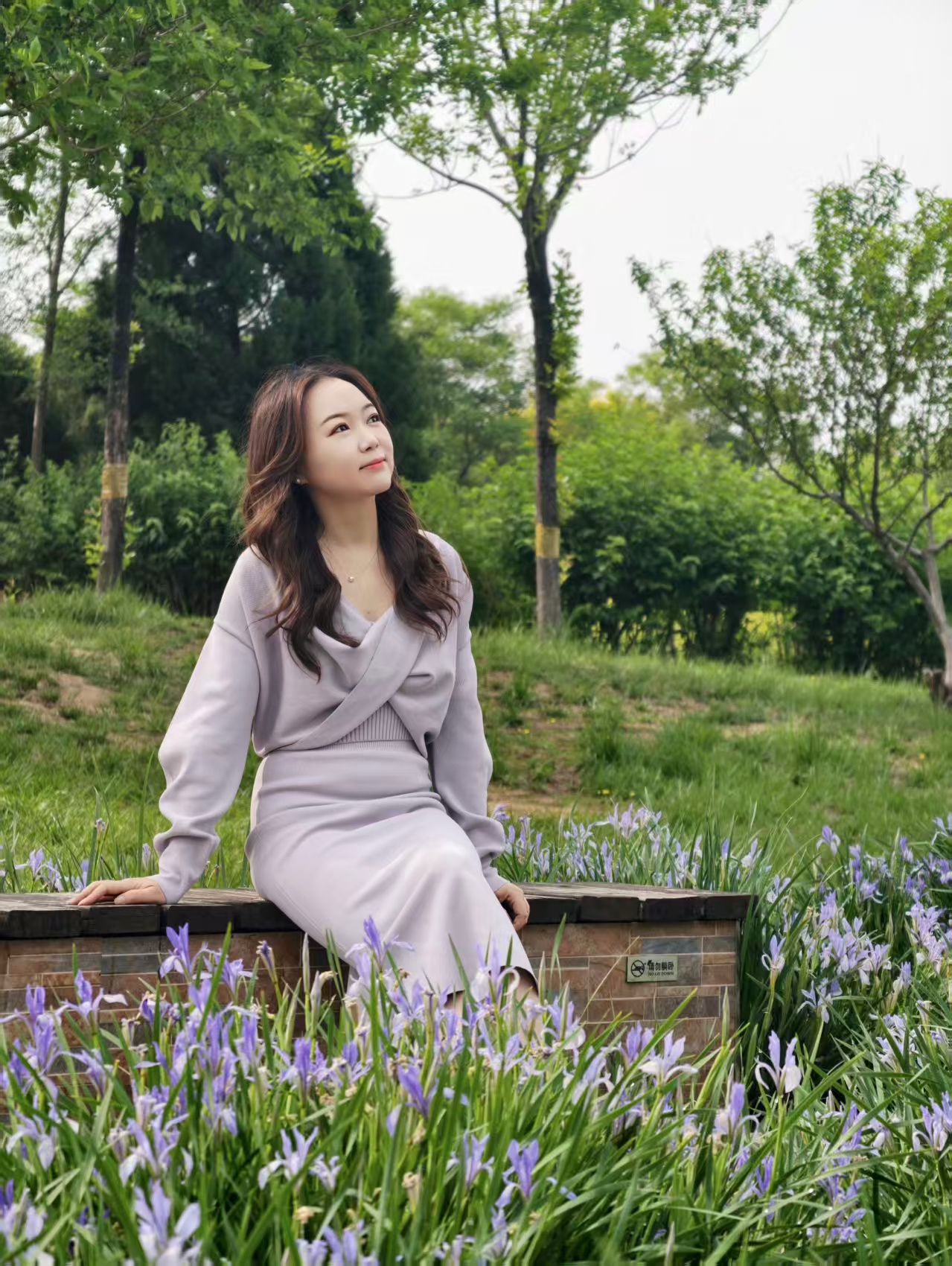 第三套淡紫色针织套装(如图③),是小个子打造“零负担高级感”的范本。针织面料自带垂坠感,不会像硬挺面料那样堆出褶皱,反而能顺着身体线条修饰身形,避免了小个子穿宽松款“被衣服吞没”的尴尬。胸口的交叉V领设计,悄悄拉长了颈部线条,露出锁骨的同时,也让上半身看起来更轻盈纤细。搭配温柔的大波浪卷发和小巧耳钉,整个人自带松弛温柔的氛围感。