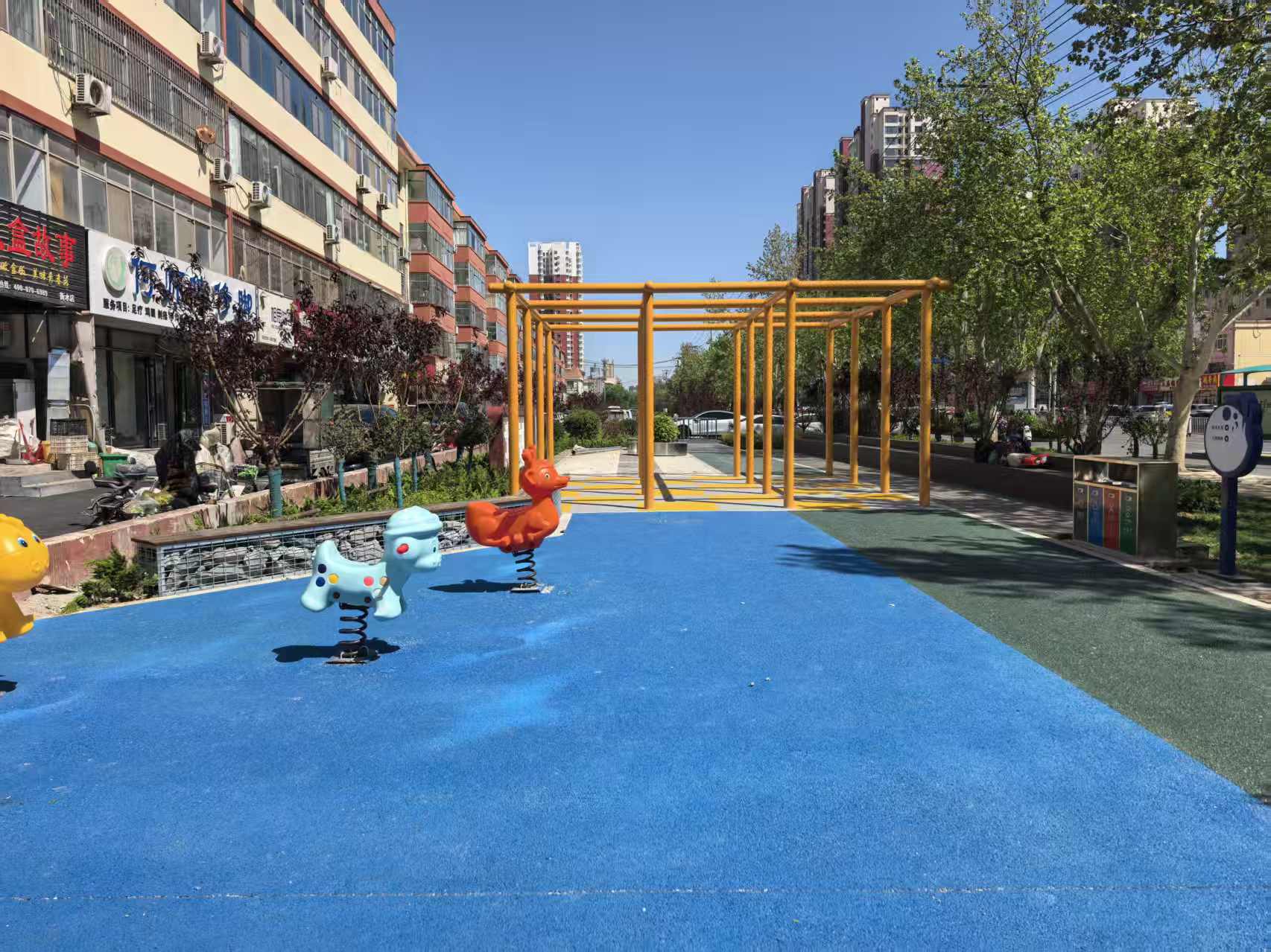 在景观打造上,胡堂排干暗涵上方海绵改造项目深度融合生态底色与美学质感,科学搭配了乔、灌、草及各类花卉,构建起高低错落、层次丰富的绿植景观。项目依托爬墙月季点缀木质廊架,打造别致立体花墙,藤蔓交织、繁花相映;通过合理优化植物布局,丰富季相变化;蜿蜒顺畅的休闲健步甬道贯穿全程,串联起沿线居住片区、沿街商业、城市道路与公共空间,让市民可漫步、可休憩、可赏景;精致小巧的休闲小品点缀其间,与透水甬道、绿地花卉相映成趣。同时,还科学配置了儿童游乐设施,完善全龄友好空间功能。