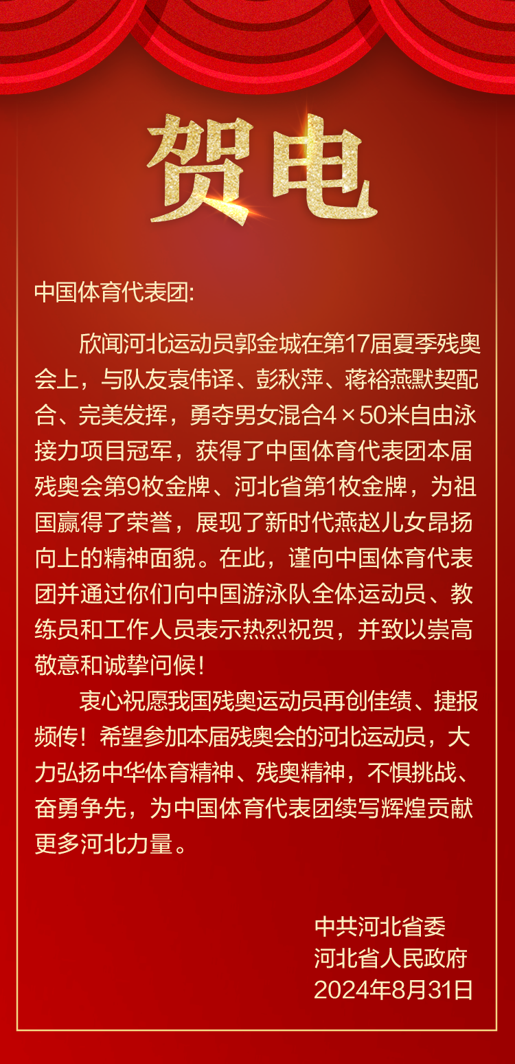 河北省委省政府向中国体育代表团致贺电